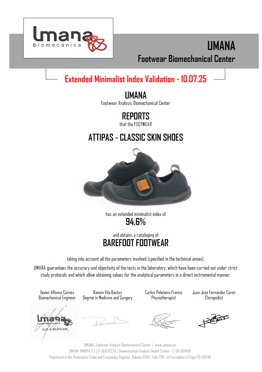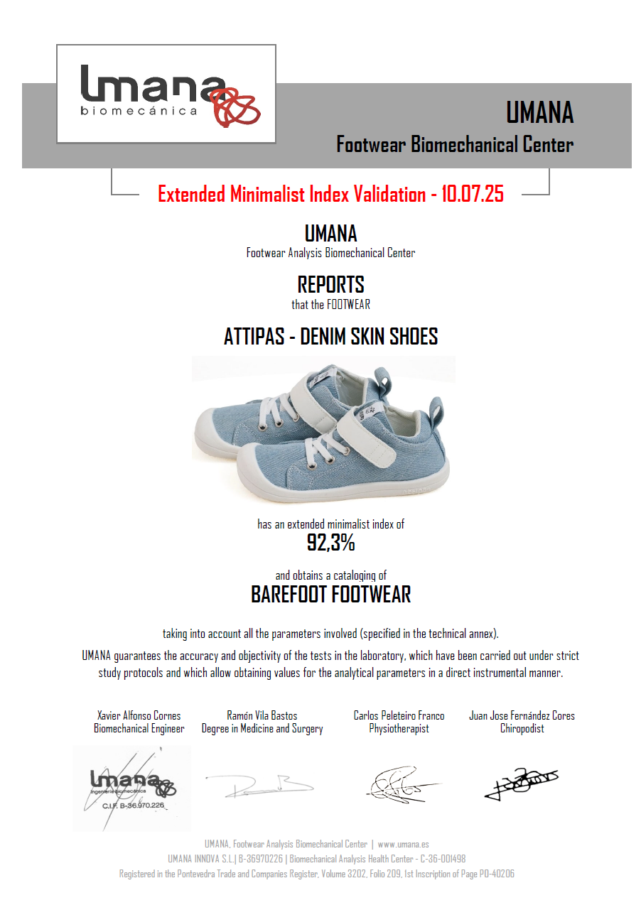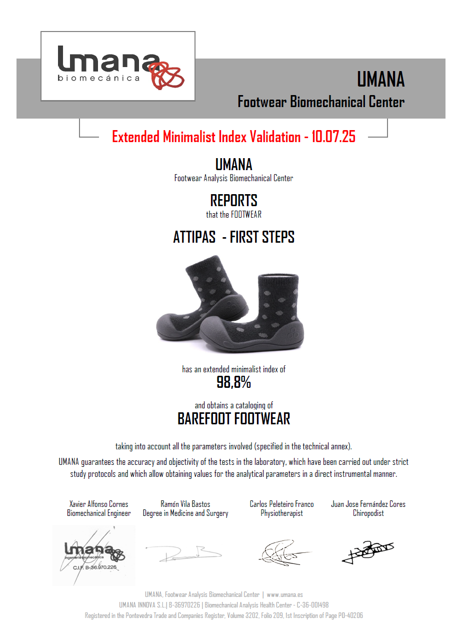 Attipas has achieved the highest UMANA certification level — Barefoot (+90%) across the Baby Socks Shoes, Skin Shoes Classic, and Denim Skin Shoes collections.